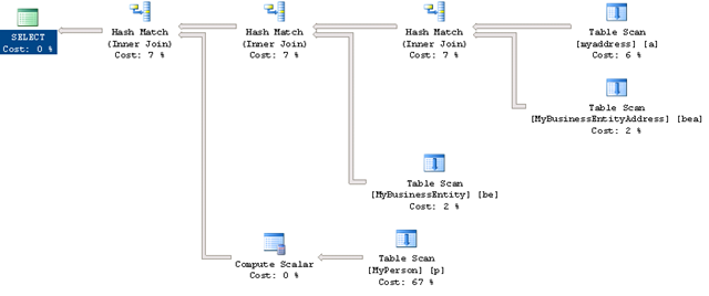 Oops. Except for the fact that we have Clustered Index Scan instead of Table Scan for most operators, the only real change to this is the inclusion of the Index Scan operation against the new index on the MyBusinessEntityAddress table. In short, no improvement at all.